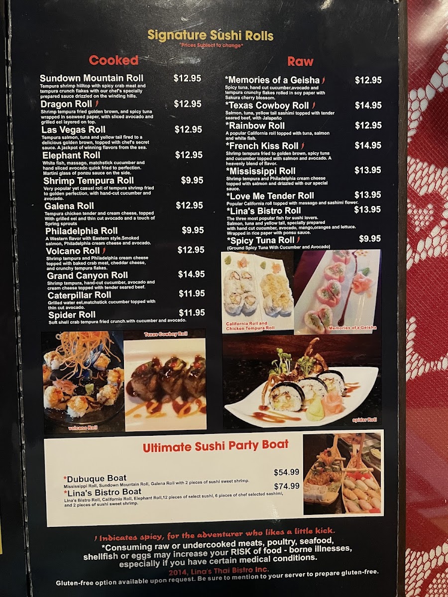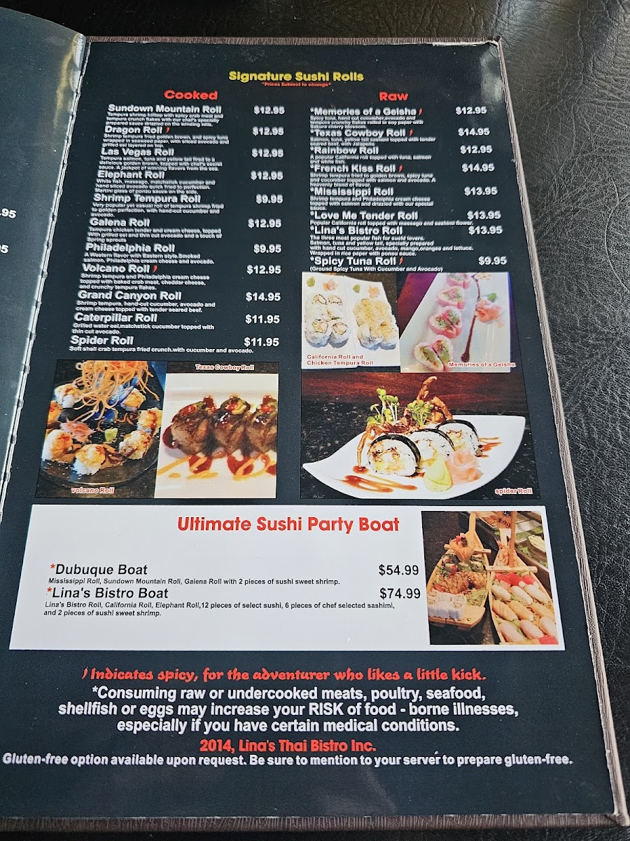 The sushi section of the menu is an absolute delight, with both raw and cooked signature rolls available. The Spider Roll, Las Vegas Roll, and Dragon Roll are just a few of the standout choices. For those craving something extra special, the Ultimate Sushi Party Boat options like Lina’s Bistro Boat or Dubuque Boat offer an exquisite sampling of the restaurant’s best sushi.