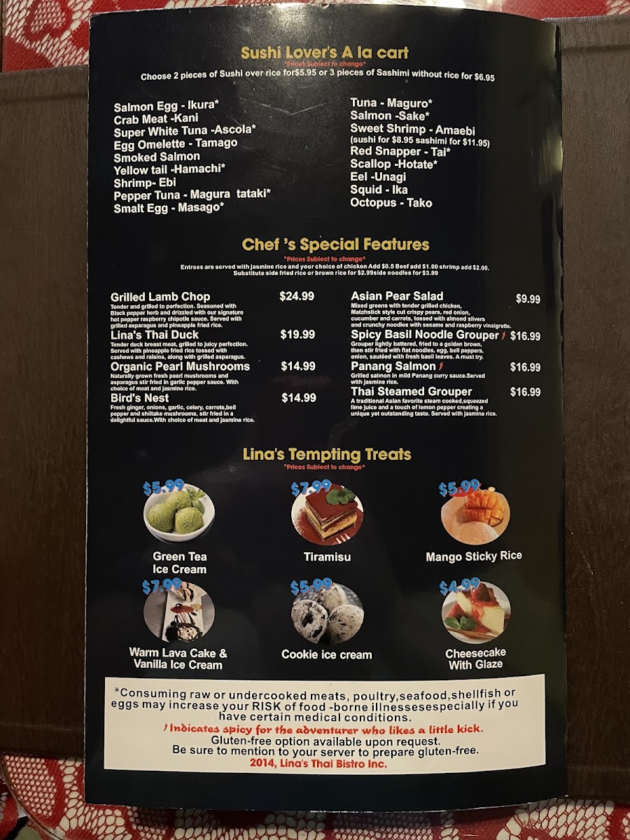 With such a wide variety of flavorful options, from fresh salads and spicy stir-fries to rich curries and sushi, Lina's Thai Bistro caters to all tastes and is a fantastic choice for any meal, whether it’s a quick lunch or a leisurely dinner.