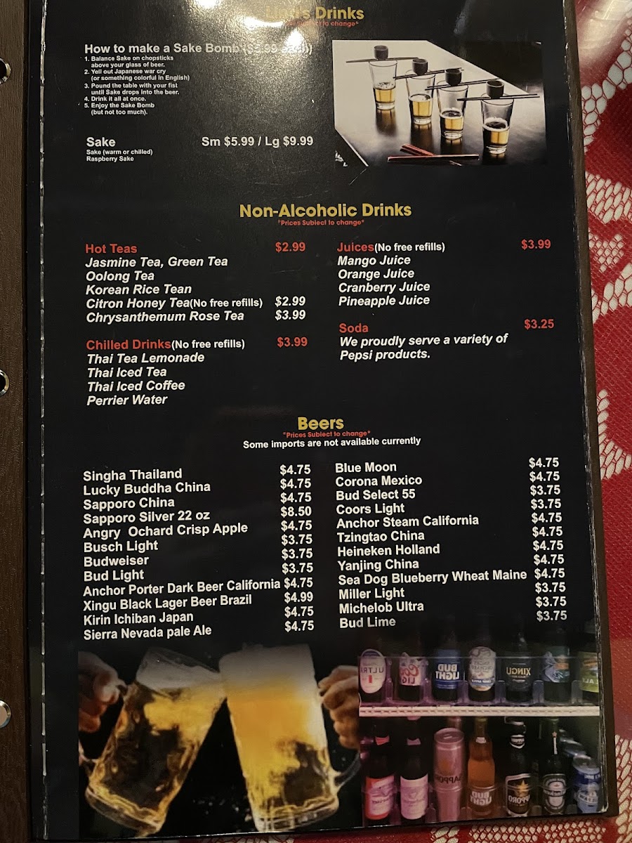 To complement the meal, the drink selection is equally impressive, featuring non-alcoholic beverages like Jasmine Tea, Thai Tea Lemonade, and Oolong Tea.